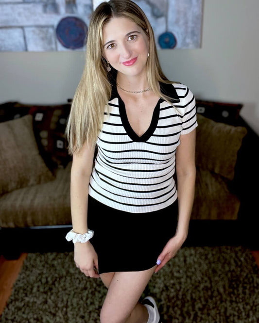 Sophisticated Chicness - Black & white striped collared knit blouse-T24175
