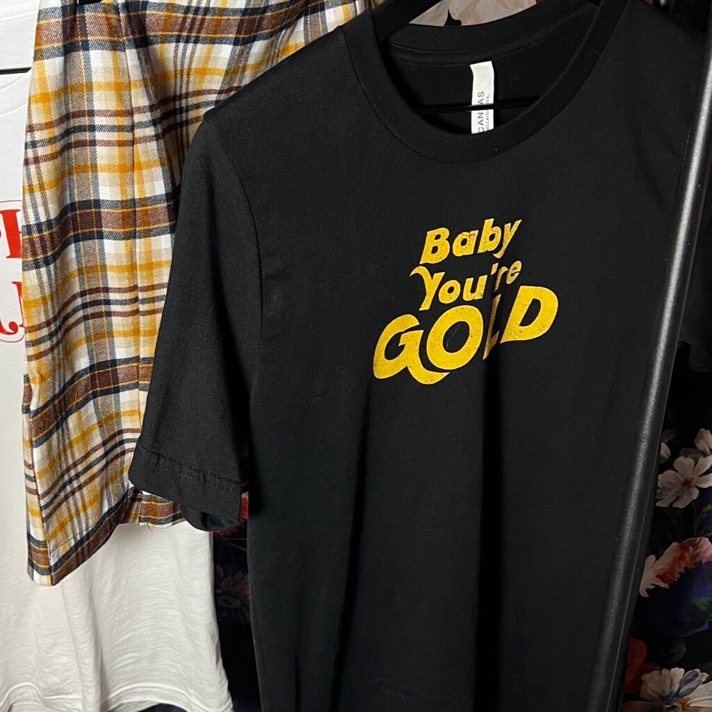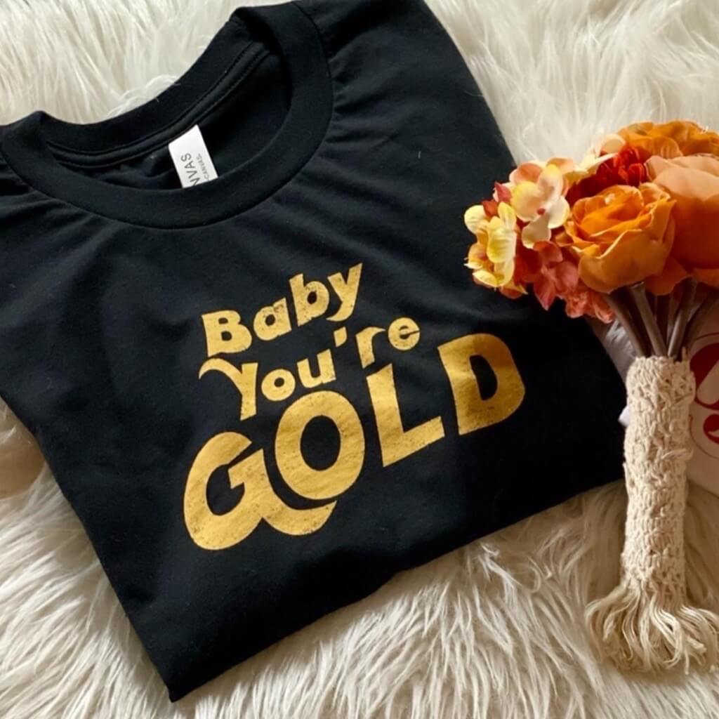 Baby You're Gold! Spark conversation and kindness in Merely Mystic's graphic tee. This women's fit soft black tee featuring the words "Baby You're Gold" in gold text is a must have in your wardrobe. Pair with joggers or jeans for a casual look, or dress up with a skirt and boots.