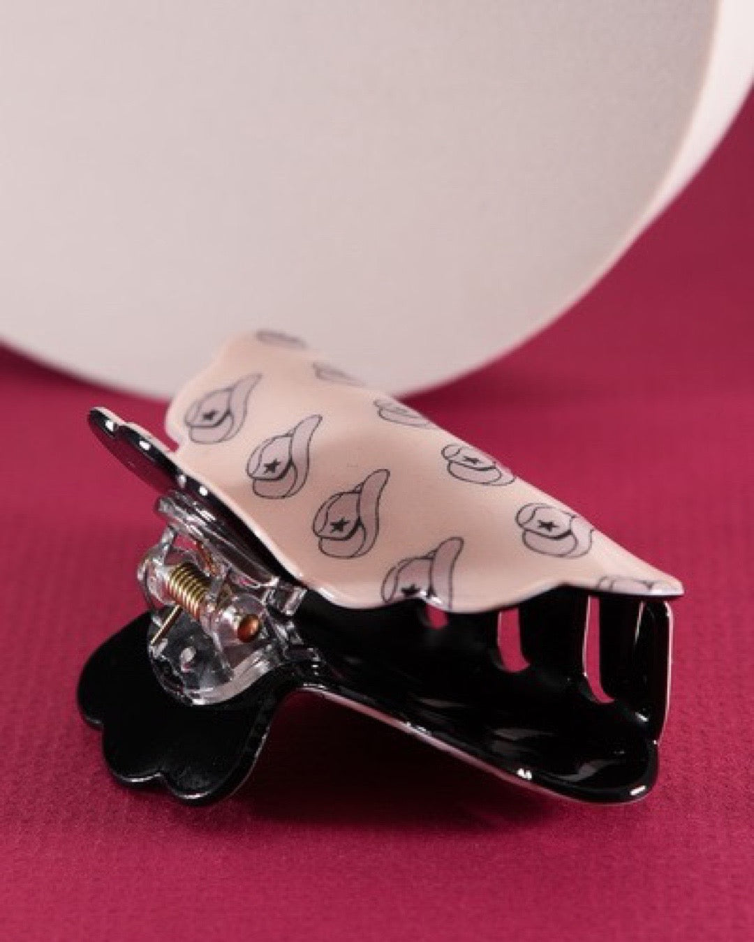 Embrace the spirit of the Wild West with our Western Wiles Beige Hat Claw. This chic and playful accessory is perfect for adding a touch of rustic charm to your look. Crafted from durable materials, this hat claw features a beautifully detailed beige cowboy hat design with a secure grip to keep your hair in place all day long.