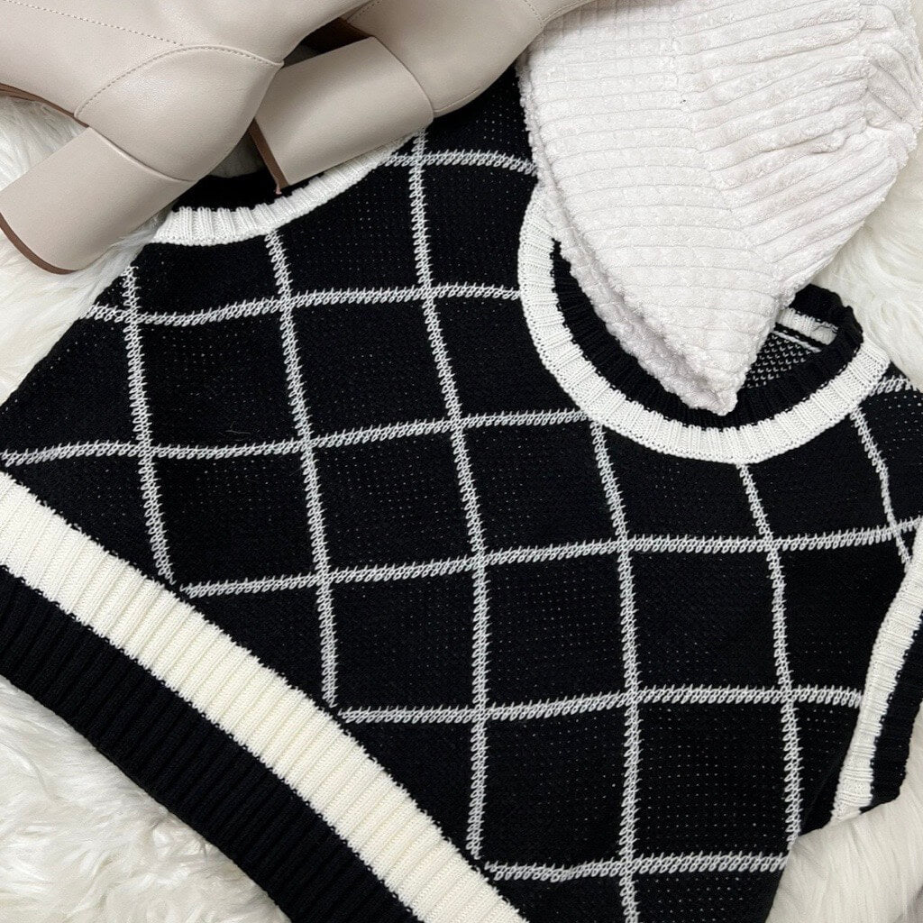 Modern Academia - Black & White Oversized Crop Sweater Vest - T2250