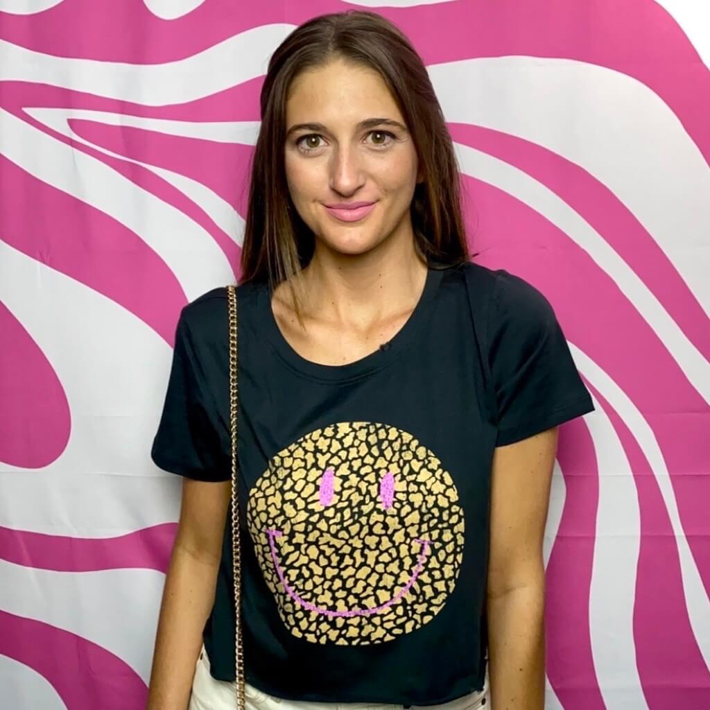 Step out of the way basic tees and make room for Prince Peter's distressed charcoal crop graphic tee that is bound to make you smile. The perfect comfy crop for that worn look featuring a distressed round neckline, short sleeves and a natural rolled hem. The graphic displays a round smily face in the center with a a yellow leopard print featuring a neon pink smiley face. Quickly liven up your basic fit with this top for all of your plans from lounging, working out, or even dress it up with a skirt!